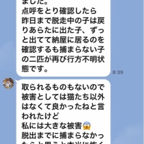 引き続き vi viちゃんの捜索をしています、今日も 地元のボランティアさん達がチラシ配りや捜索をして下さっています、チラシを見た方からも連絡が入っていますが 見に行くとそこにはいないのでまだ確認は出来ていません。下は昨日の午前中だそうです、見かけた方 ...