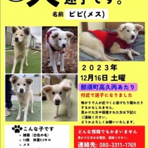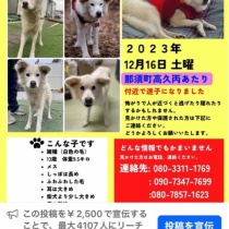 動物病院さんはお休みでしたので、ポストに入れさせて頂きました。あちこちにで出会った方には声を掛けてチラシをお渡ししています、コンビニも回ってチラシをお渡ししています途中で 朝から探して下さっていたご夫妻からお電話があり 野良犬さん達が沢山いる場所があった ...