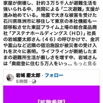 珠洲市の方からLINEで連絡が来ました、今日は避難所でボランティアをしているので 電話が使えるそうです、犬もいるのでお父さんに預かって頂く予定でしたが、出来れば一緒に避難して来たいとの事で 大家さんに聞いて頂いたらどうぞと言って下さいました、大家さんも本 ...