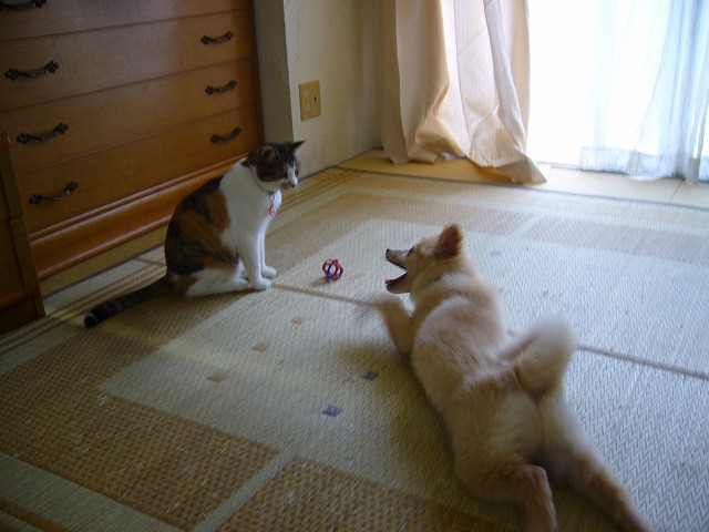 猫さんとも 仲良しになって、 遊ぼうよ〜と 誘っている様ですが 冷めた目で 見られているようで、、、