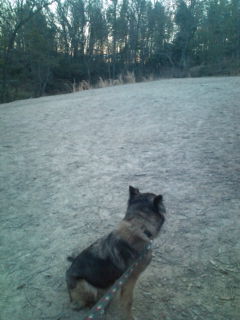 モコちゃんを連れてドックランの中の山を散歩しています、