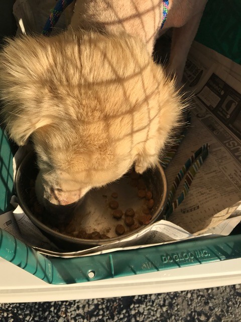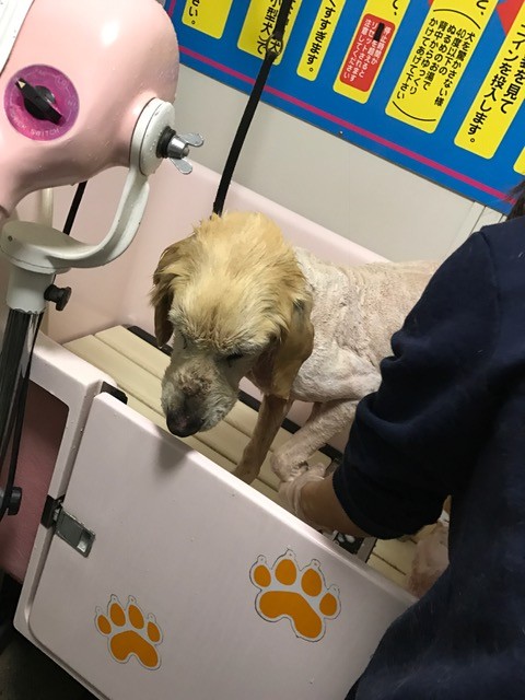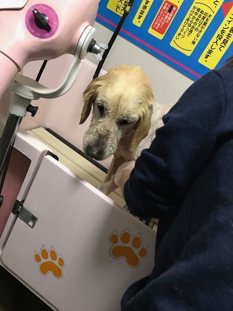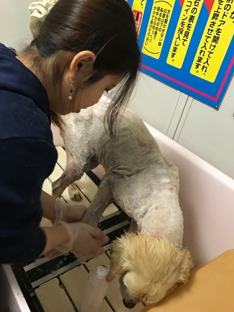 痩せて皮膚病も有るゴールデンですので 、とりあえず沢山食べさせて シェルターに着いたら トリマーさんに薬浴とシャンプーをお願いしました。