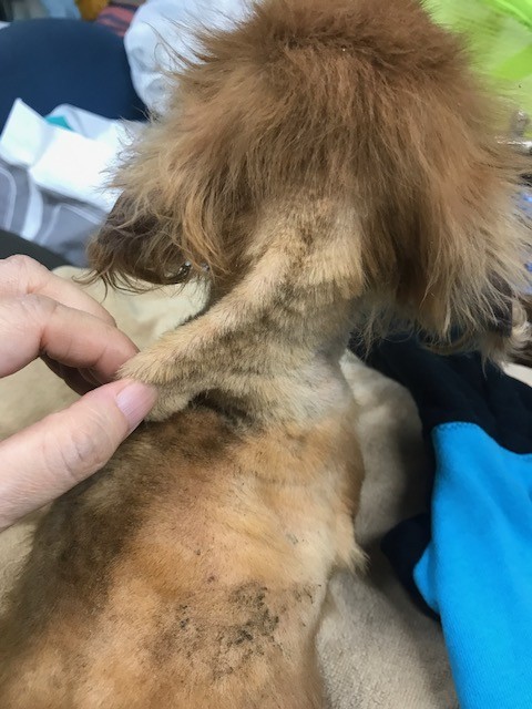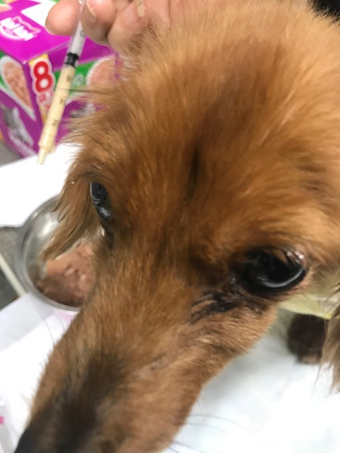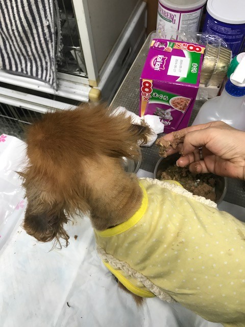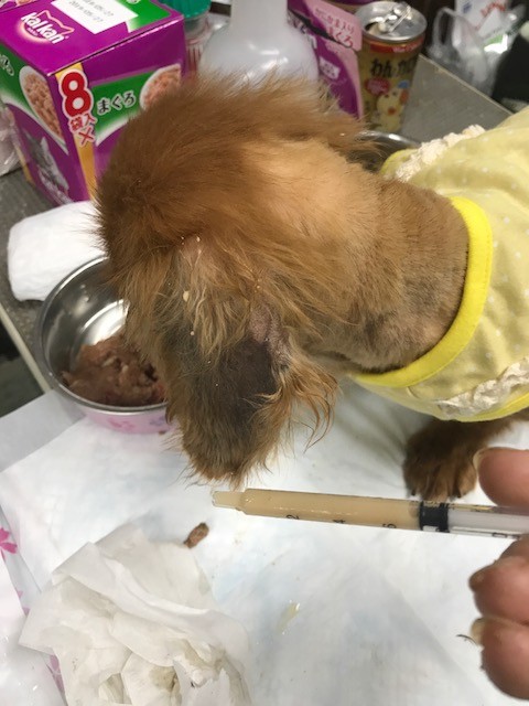 今回も 痩せてガリガリの ダックスちゃんがいて 、缶詰めを置いても 全く食べず うずくまっていましたので 首の後ろの皮膚を摘んだら、