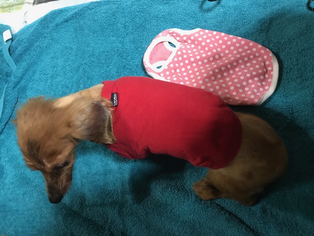 チワワ用の服を着せました、二枚重ね (⌒-⌒; )