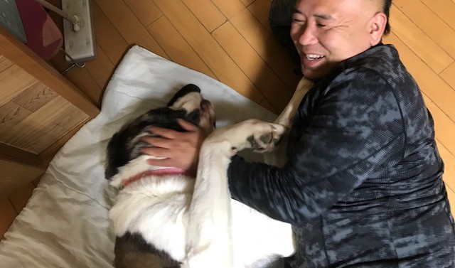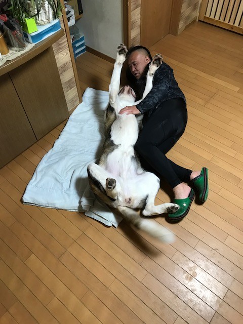 コンクリートの上しか知らなかったセントバーナードが 温かな 布団で パパさんに 溺愛されて大事にされています。