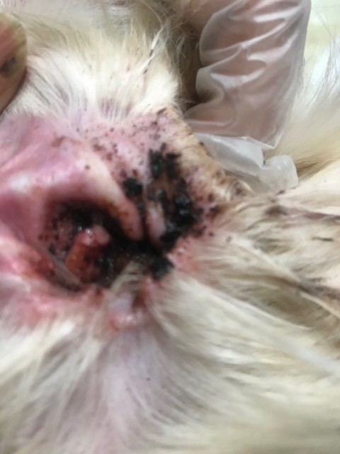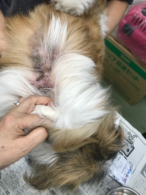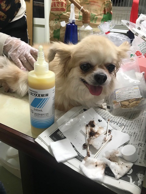 そして 耳や身体のチェックをすると 酷い耳ダニやマラセチアのチワワがいました、早速イヤークリーナーで洗い ヒビクスを入れました。