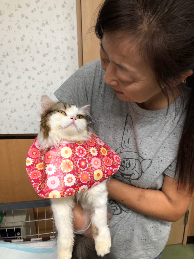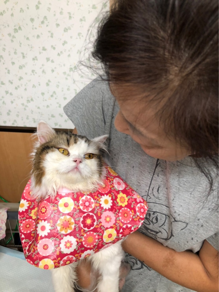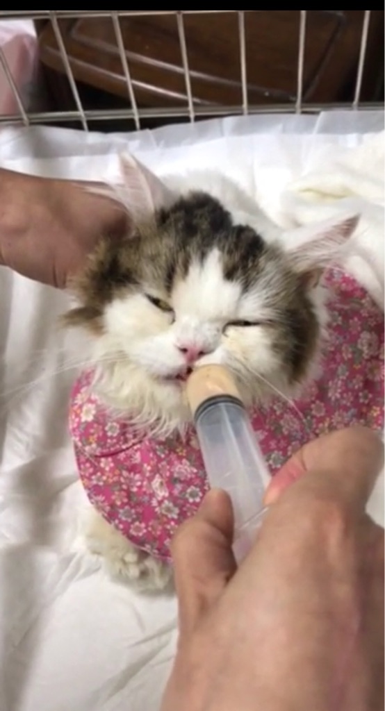 自分では殆ど食べられ無くなったキリちゃんに毎日何回か シリンジで 栄養食を飲ませています。その時 胸に 流動食が垂れて汚れてしまうからと 手作りよだれかけを作って下さったのです。