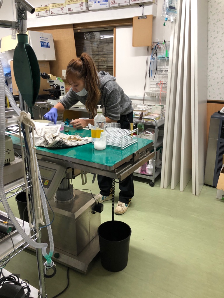 スタッフさん達も  先生の助手を担当してくれる方が何人かいて 手術道具の滅菌や 保定、検便などの勉強をしています。