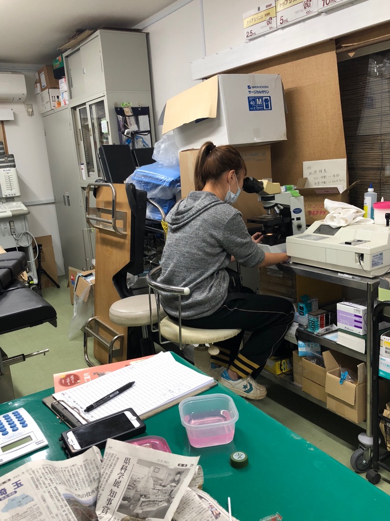 シンザツで 手術待ちの キャンタくんが下痢をしていたのでスタッフさんが 早速検便をしてくれました。
