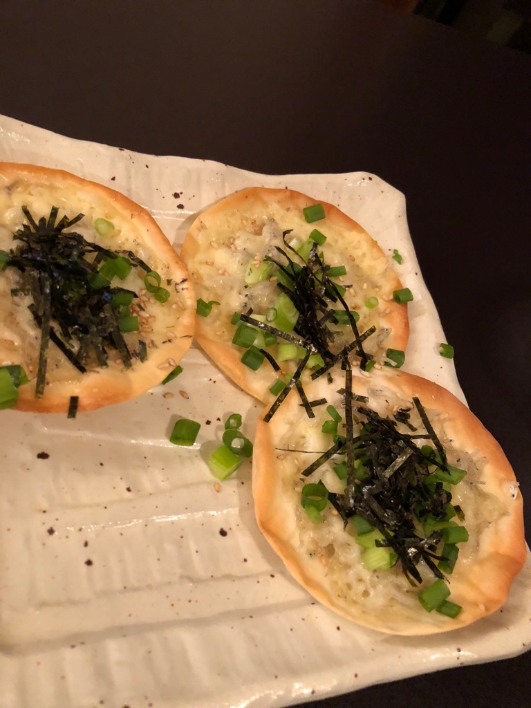 餃子の皮に しらすとチーズ、海苔、ワケギなどの乗ったピザ パリパリして 美味しい!