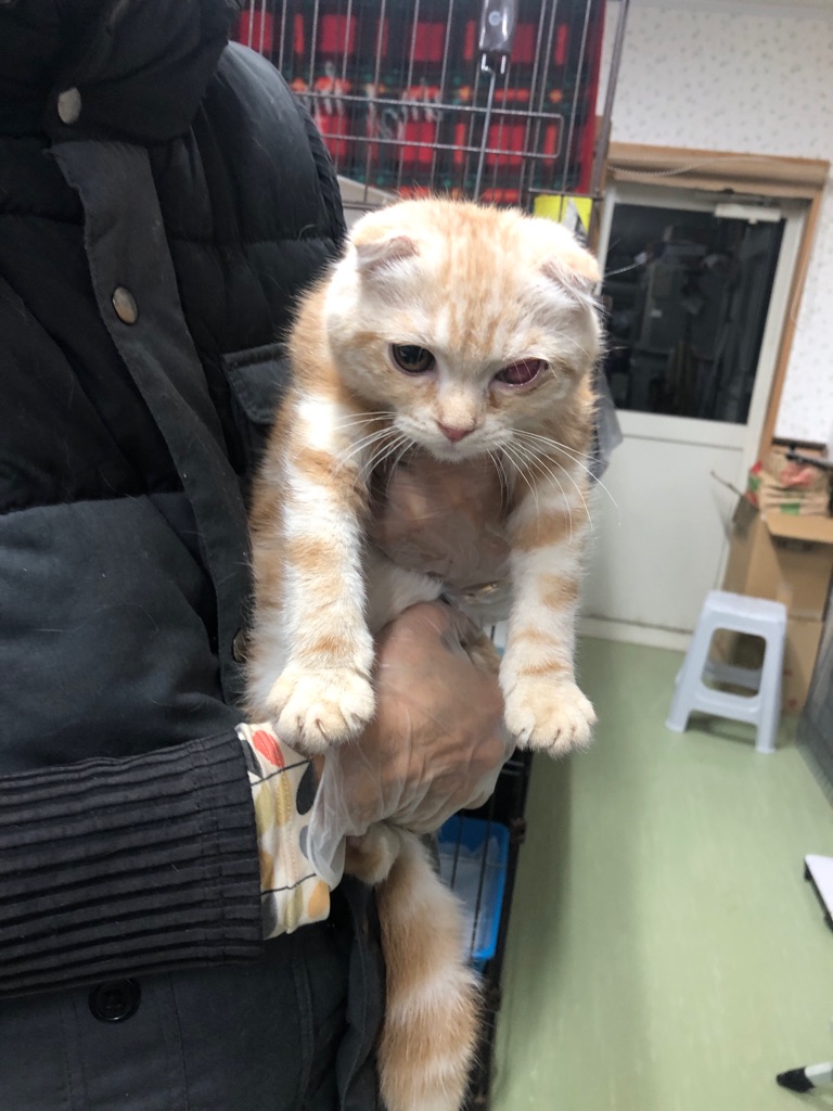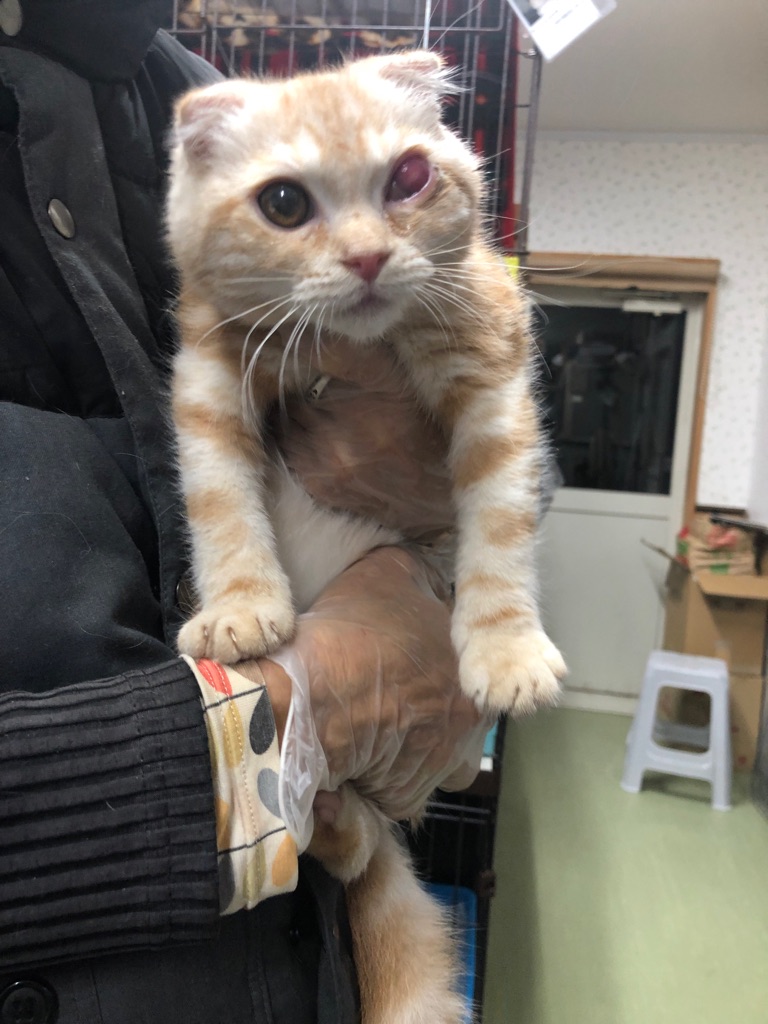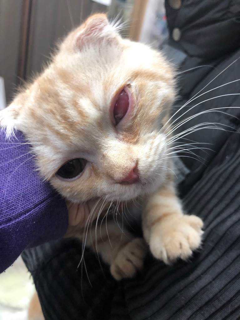 このスコティッシュの 子猫も 片目に障害を持っています。ベージュリーくん四ヶ月くらい。