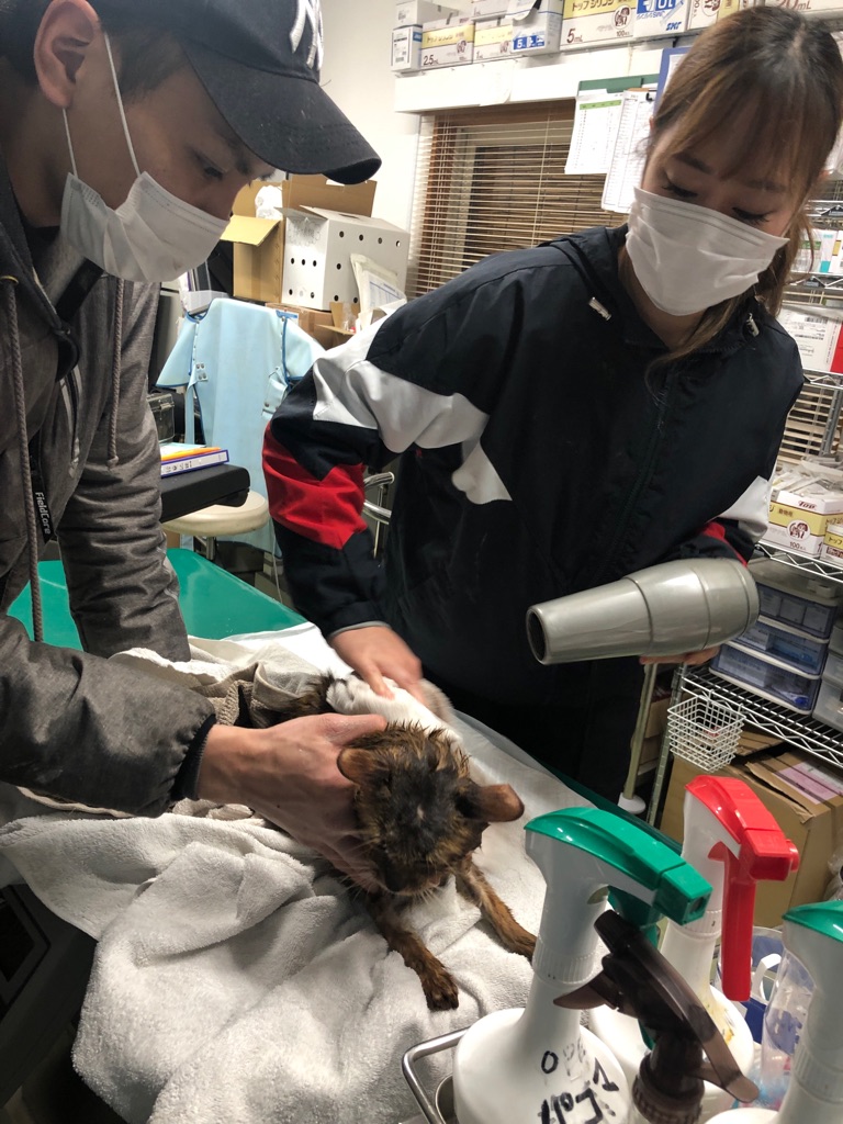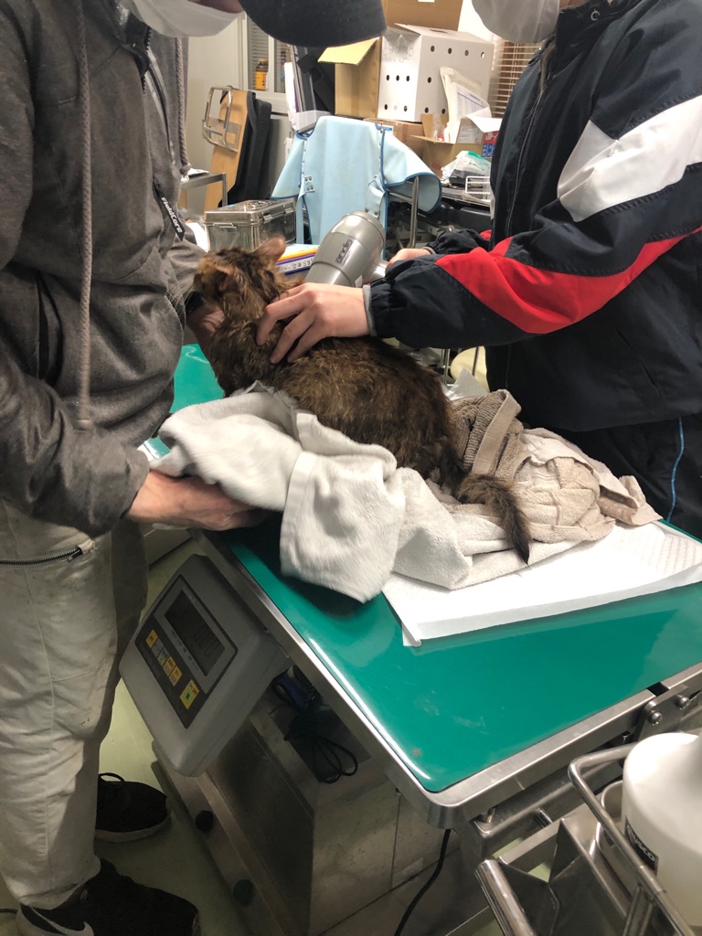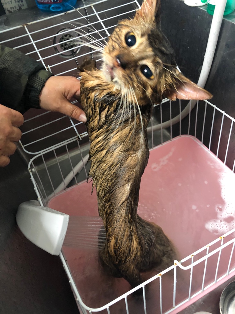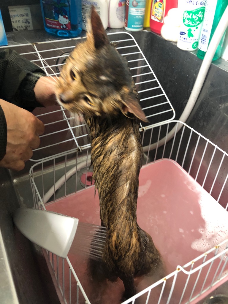 この猫ちゃんは ガリガリでした、身体中に糞尿が付いていて 凄い臭いなので 早速洗って貰いましたが、骨と皮、、、😱 😥