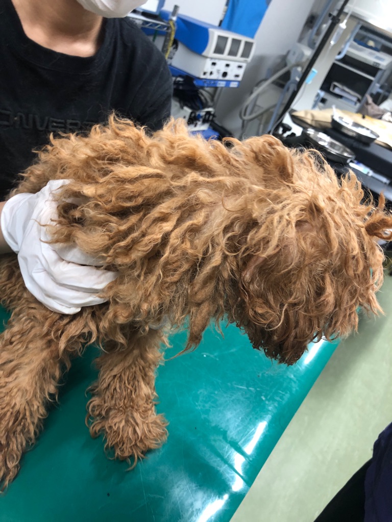 レスキューした子は 長年の汚れで ぼろぼろです、トリマーさんのハサミが 切れなくなって来ていると相談がありました。