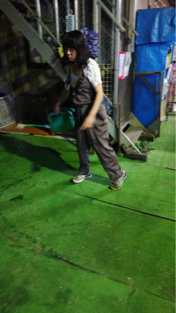 夜は犬を入れて 人工芝の ハイター消毒です。