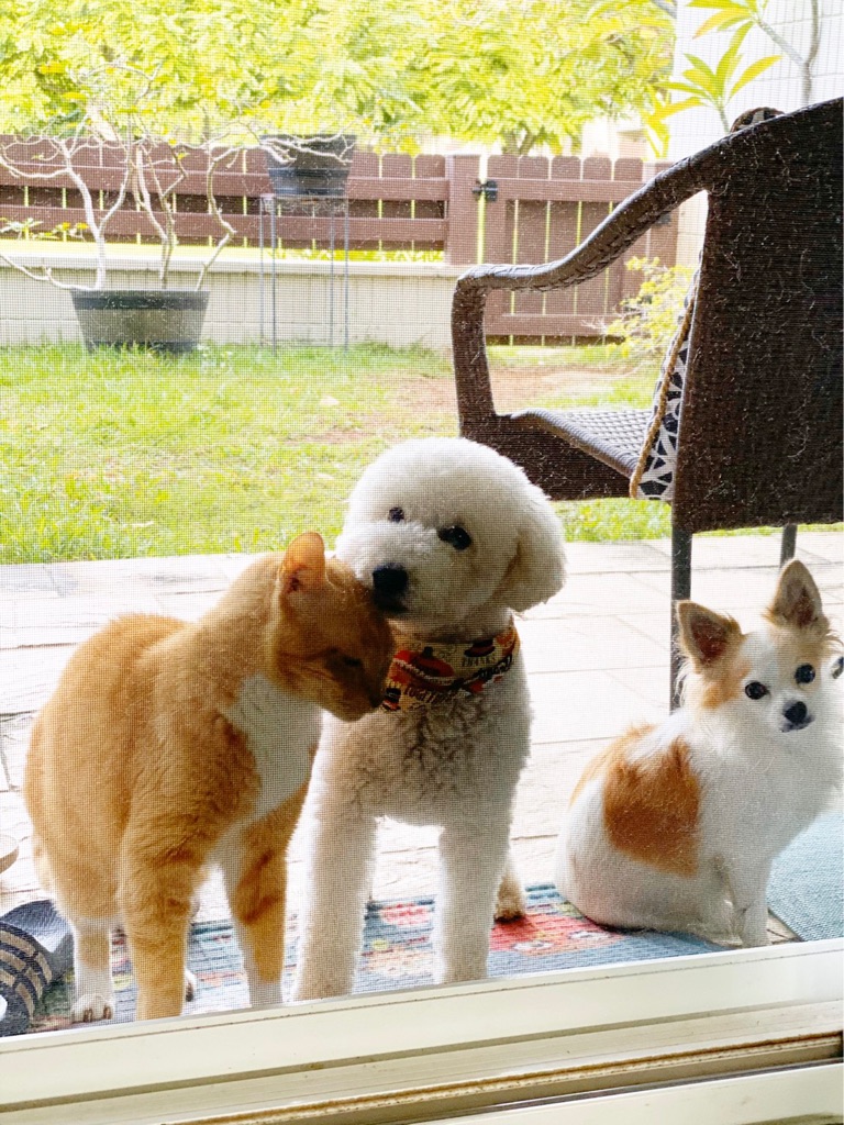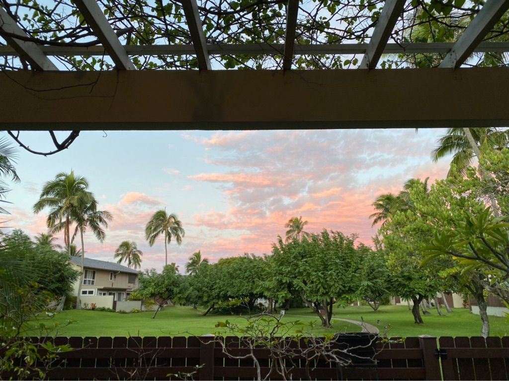 ステキなハワイの朝焼け、澄んだ空気、瑞々しい緑の木々の中で幸せに暮らす アイリちゃんとコボちゃん💓🐶🐶💓です。