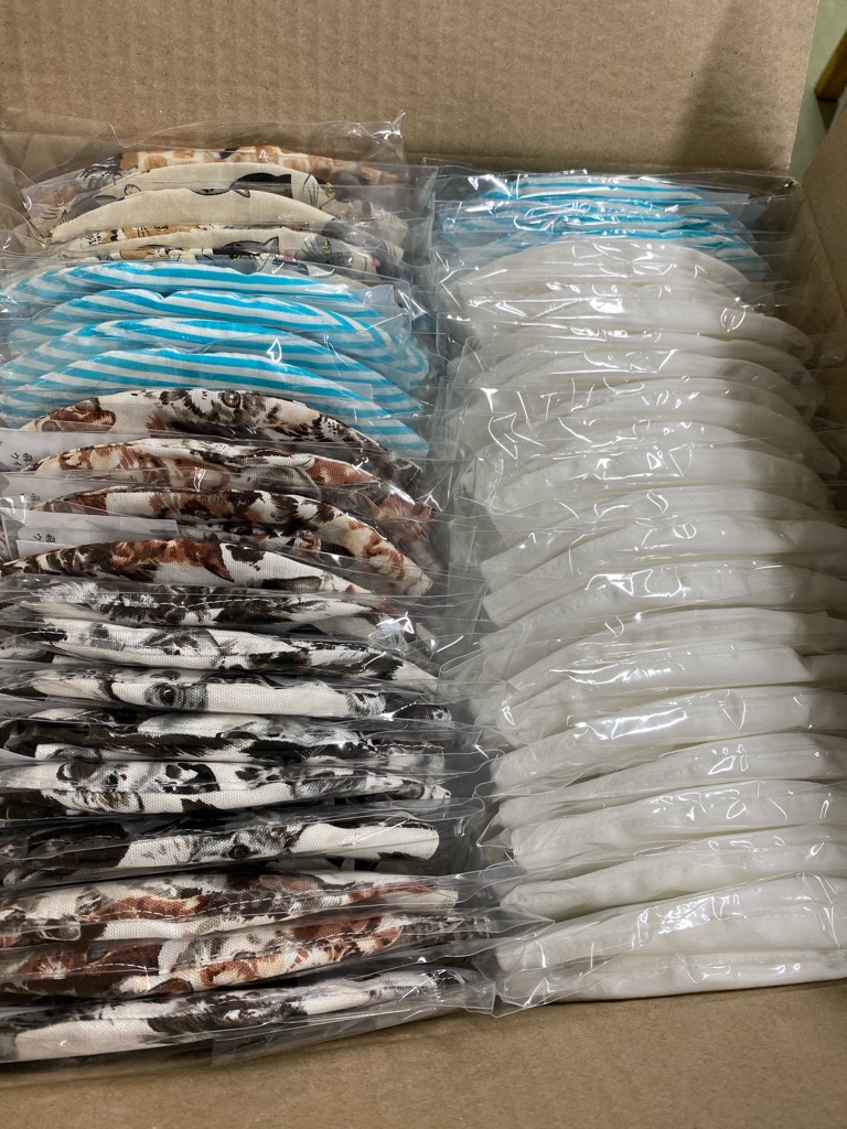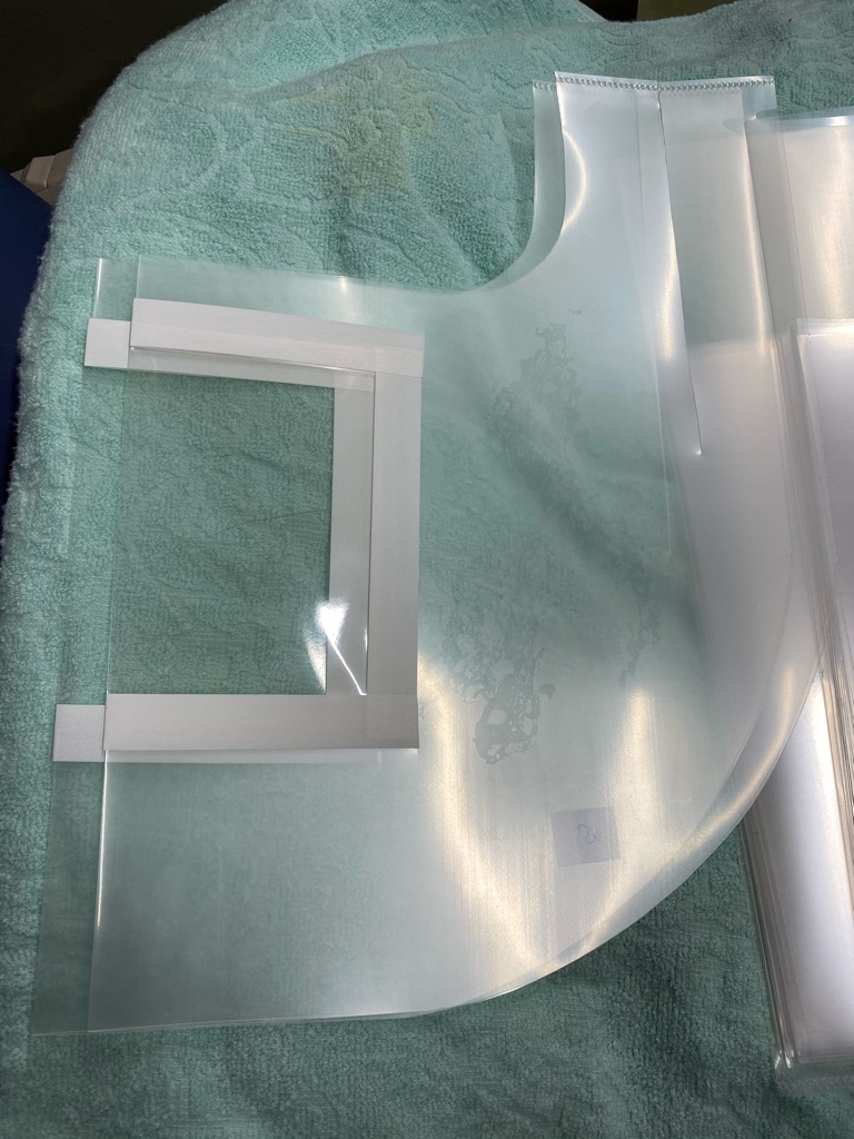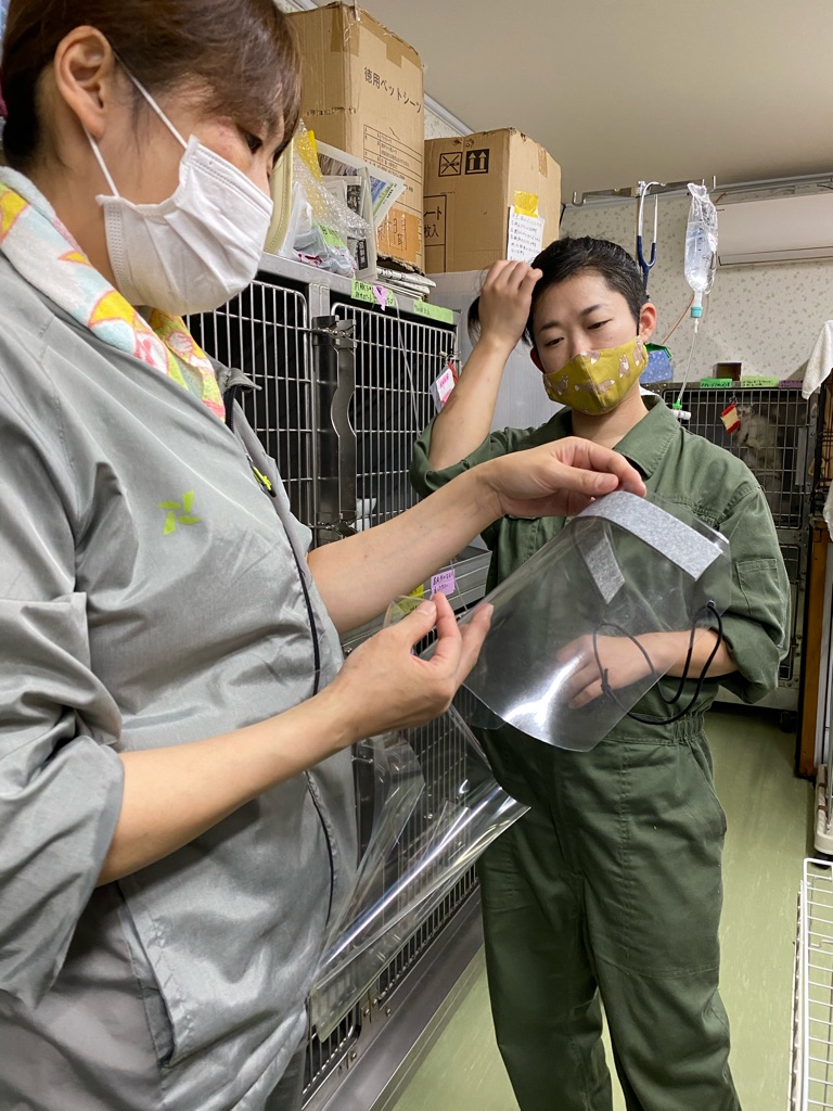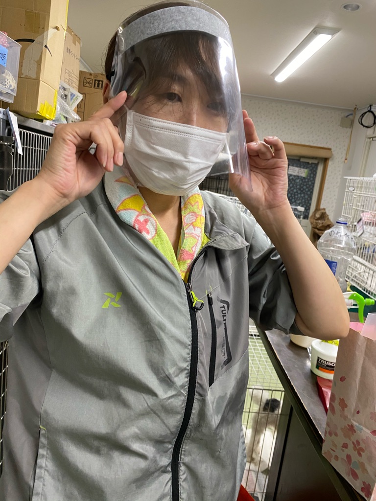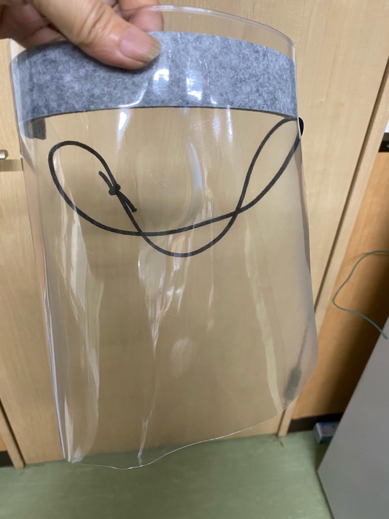私達も出来る事を考えて 医療関係者の方々を応援したいと思いスタッフさんや協力ボランティアさんにフェイスシールドやマスクの製造をお願いしています。