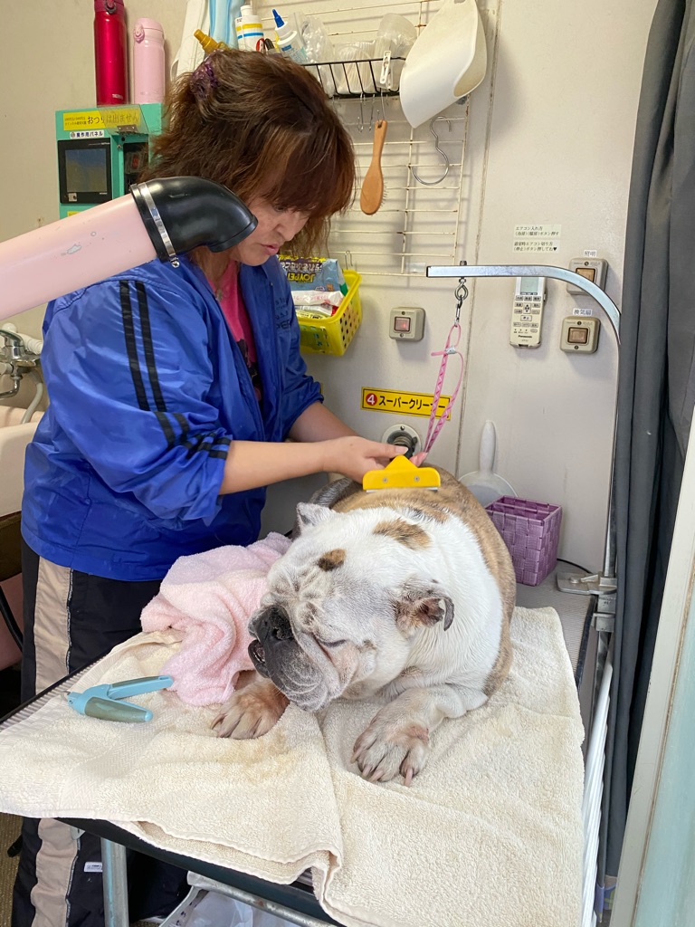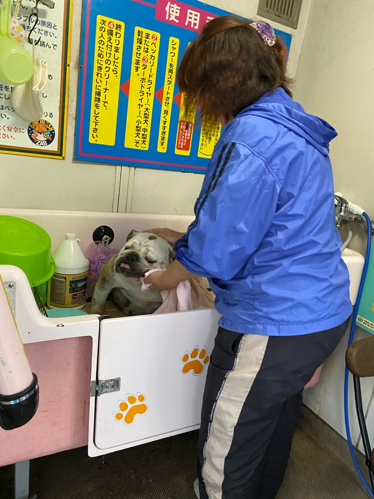 ブルドックの 女の子はベタベタだったので、早速シャンプーをしてもらいました。