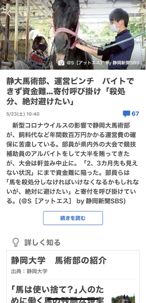新型コロナウイルスの影響で静岡大馬術部が、飼料代など年間数百万円かかる運営費の確保に苦慮している。部員が県内外の大会で競技補助員のアルバイトをして大半を賄ってきたが、大会は軒並み中止に。「2、3カ月先も見えない状況」にまで資金難に陥った。部員らは「馬を殺処分しなければいけなくなるかもしれないが、絶対に避けたい」と寄付を呼び掛けている。