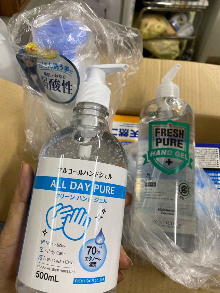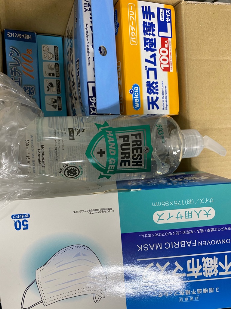 沢山のマスク、アルコールジェル、手袋、