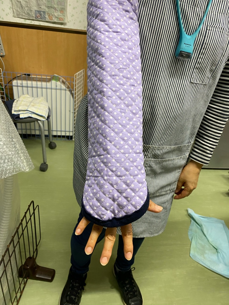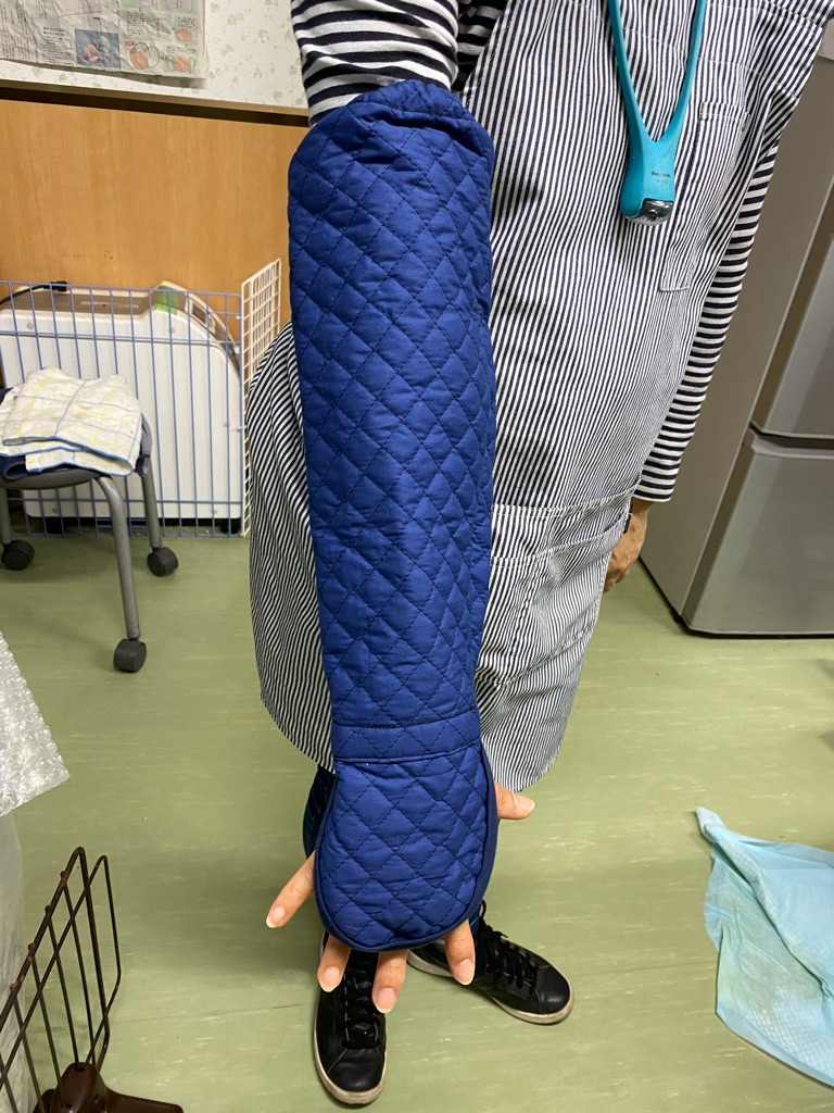 この腕カバーは レスキューの時に怖くて噛みつく犬がいるので 防御の為にナタリーママさんが作って下さいました、