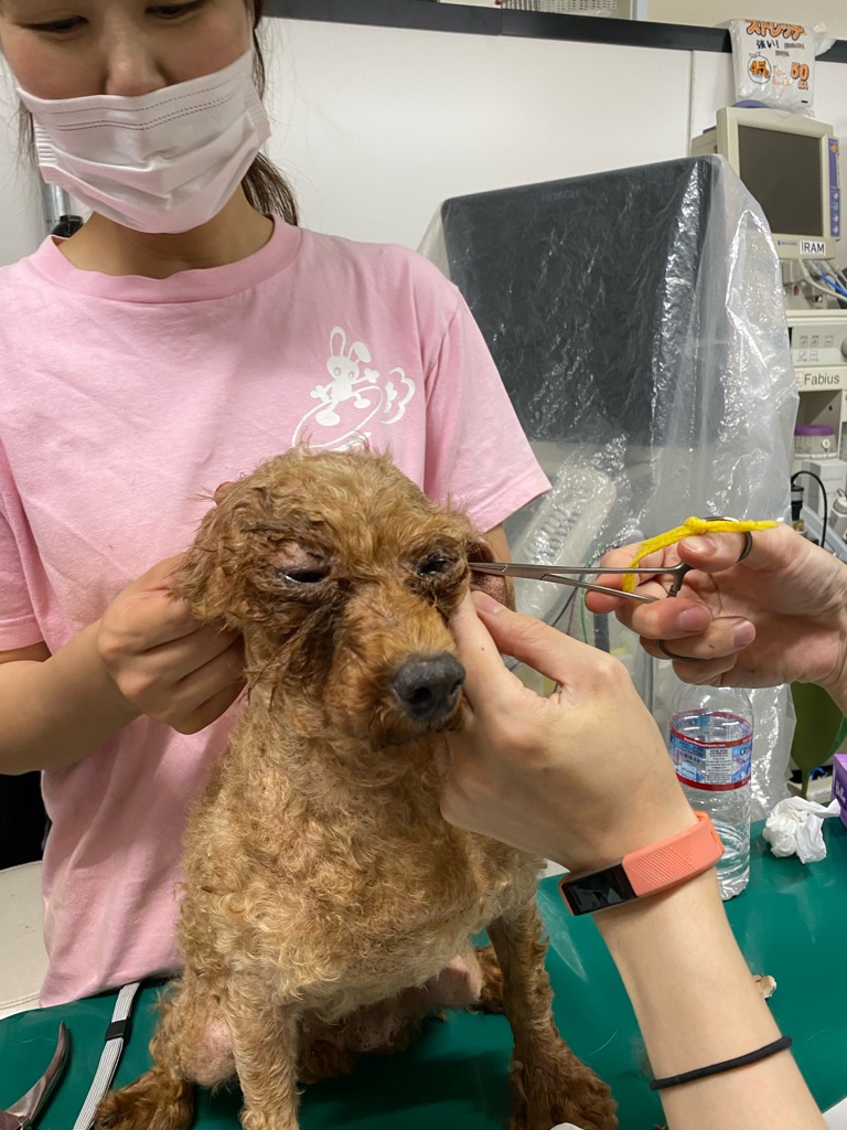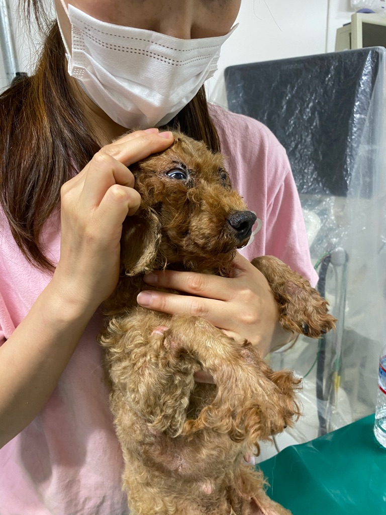 このお母さん犬もぼろぼろです、耳の中はヘドロの様な耳垢が詰まっています。