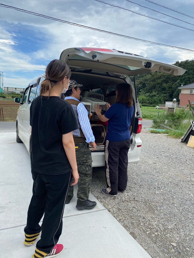 ケージを積み込み 餌、おやつを持って