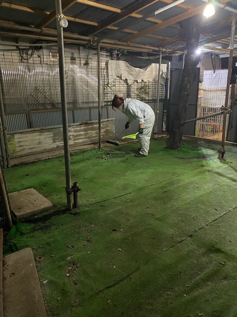 今夜は人工芝にハイターを撒いて ケルヒアで熱消毒しました。
