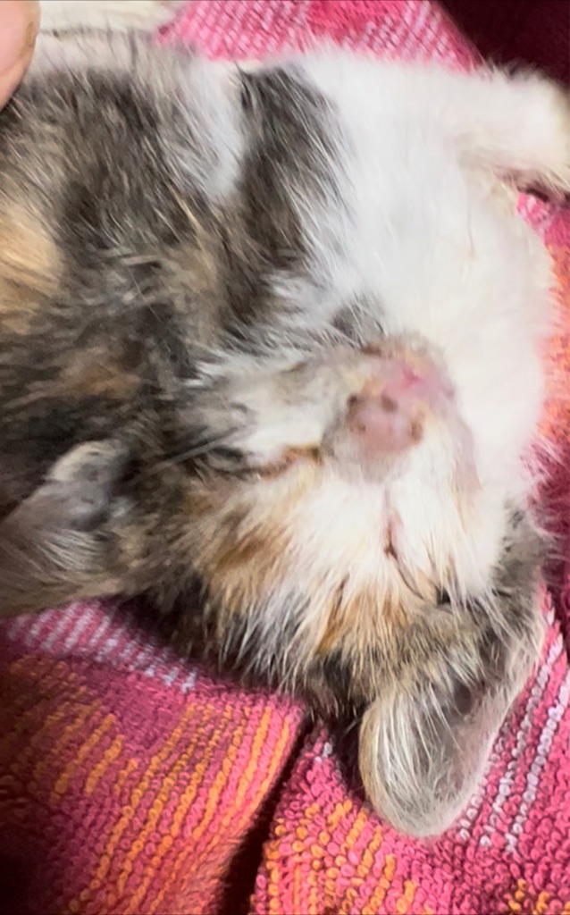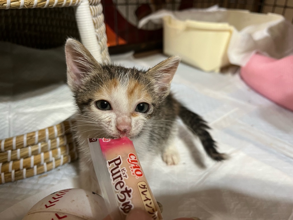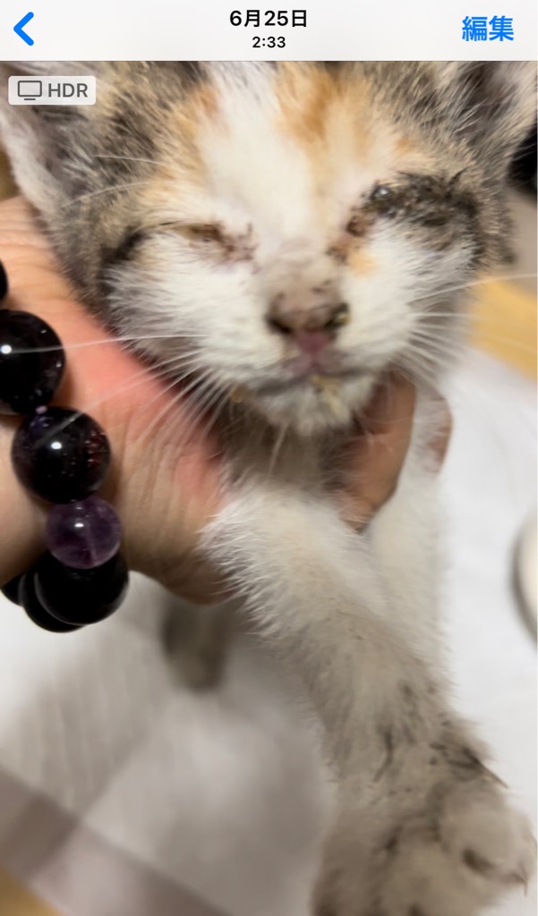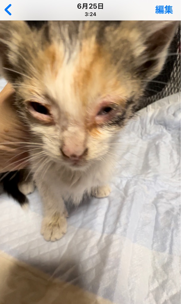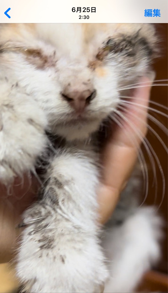深夜の道路にうずくまっていたみかん🍊ちゃんは目がメヤニで固まり動けなかったのです、