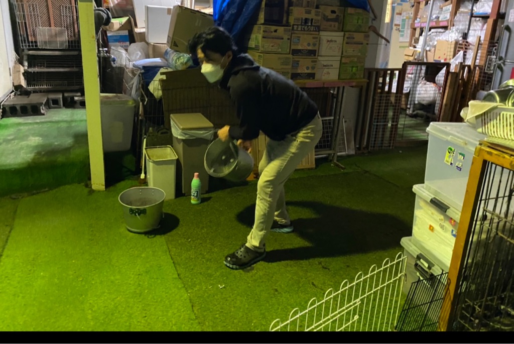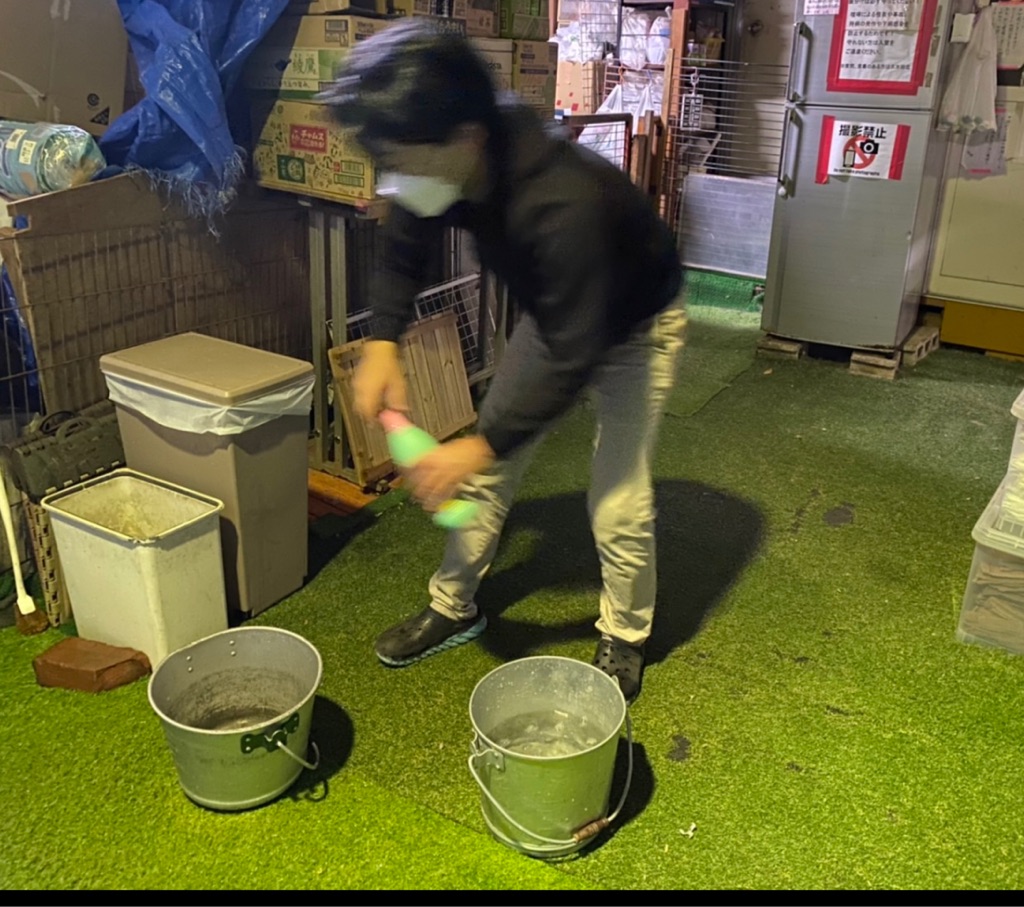 スタッフさんが夜間に人工芝にハイター を薄めて