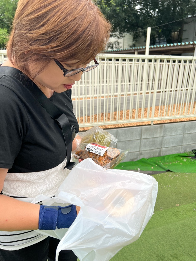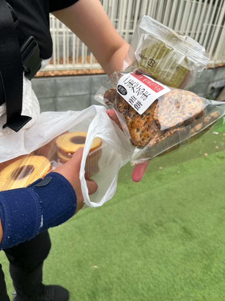 下は差し入れのバームクーヘンやパウンドケーキ、お煎餅を持って来てくれた リッたんのママさん、