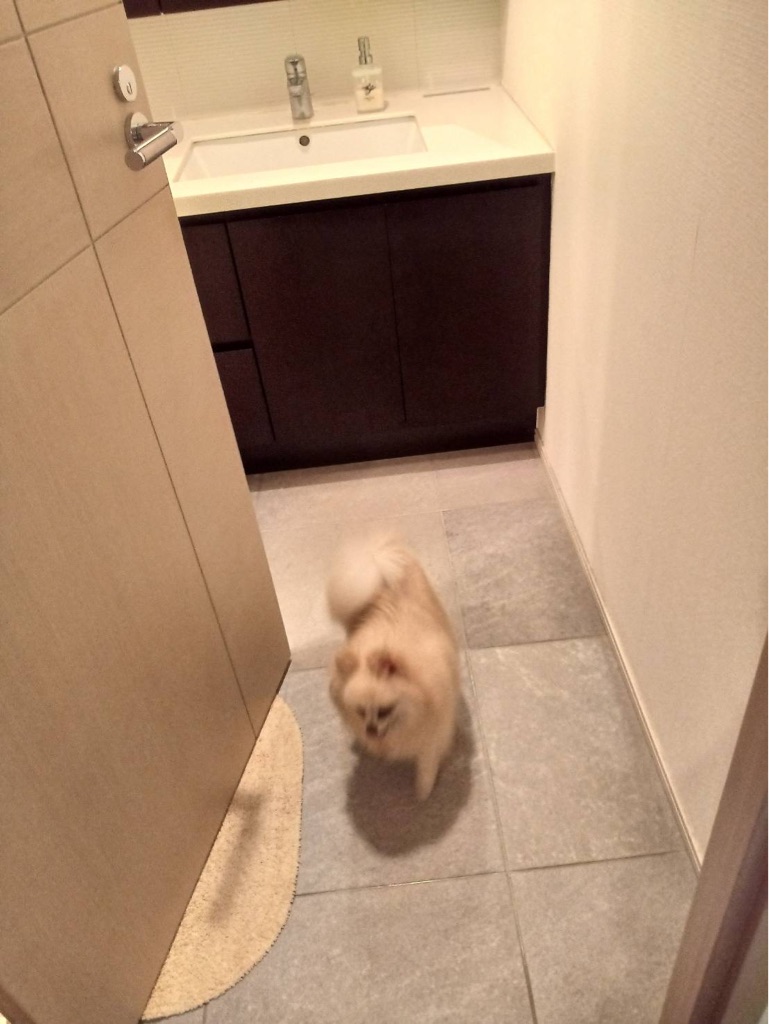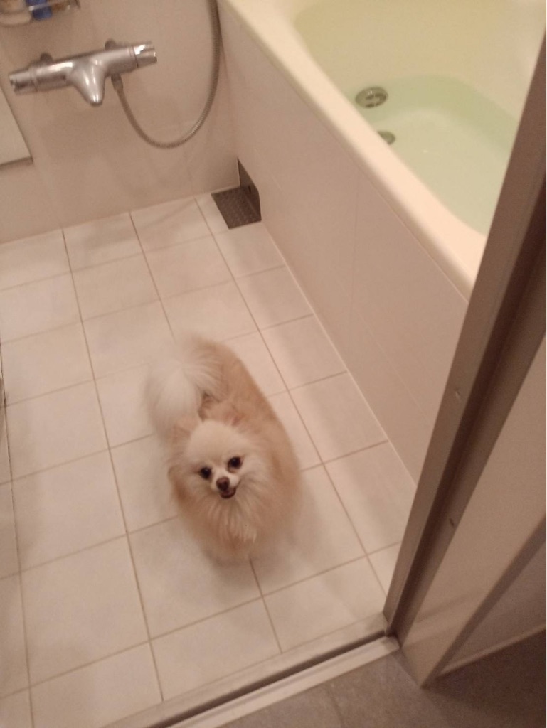 だいぶ慣れて来て お風呂場まで付いて来るようになりました。