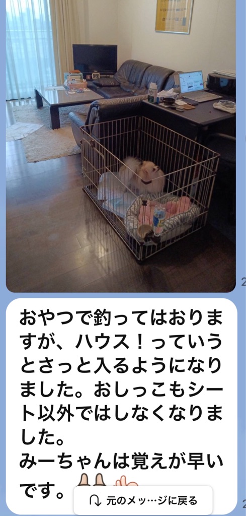 一人になると鳴いて居たようですが、里親様がいろいろ工夫して下さって良くなって来たようです、