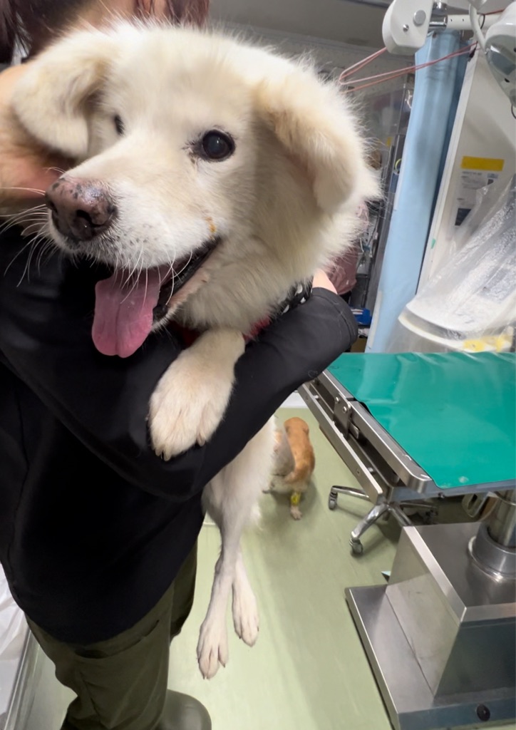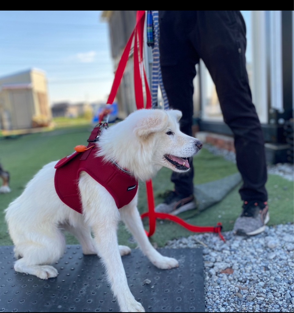 那須ハイランドの管理事務所に、那須街道にある道の駅辺りで、ハーネスをした白い犬が歩いていた。という情報があったそうです。