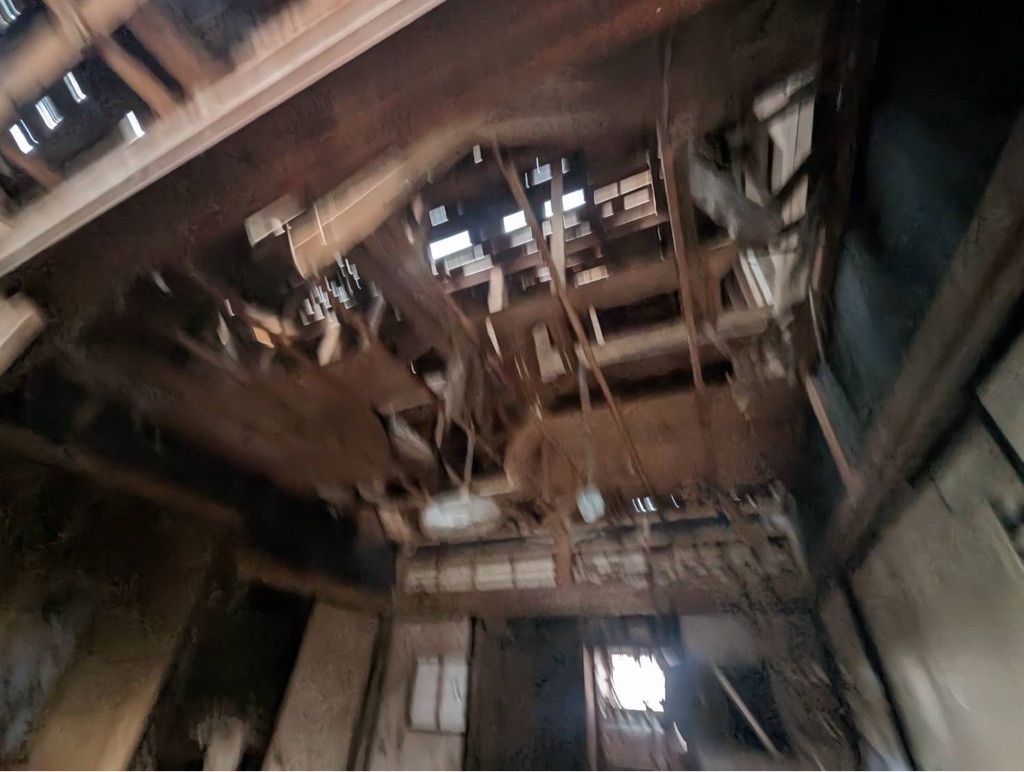 屋根瓦は落ちて 屋根に大きな穴が空いています、雨が降ったので雨漏りで居場所が無くなり