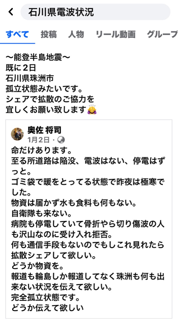下は震災2日目の投稿です、本当に悲惨な状況です、 今も珠洲市の大谷町辺りは電気も電波も届きません、