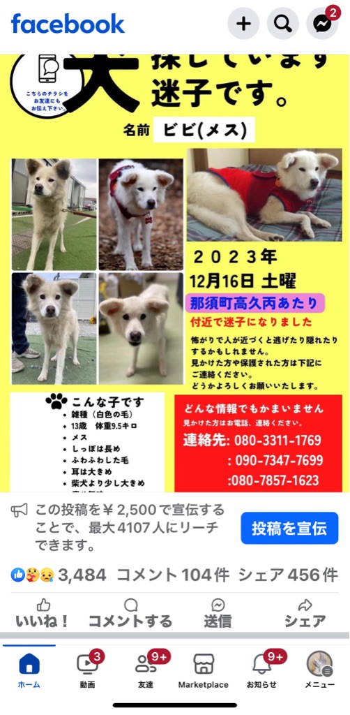 白い犬がいたと情報が有れば見に行っていますが違っています。