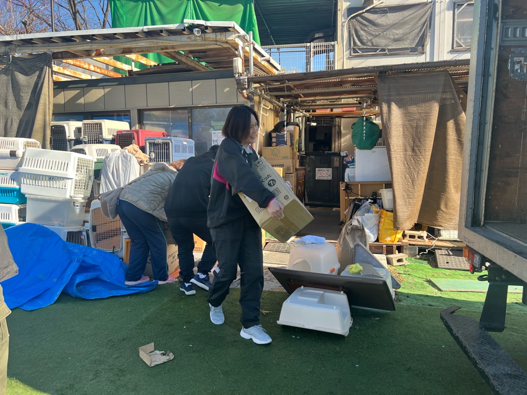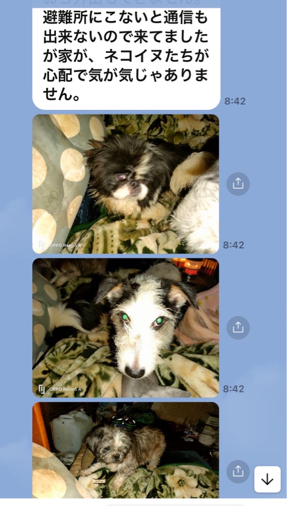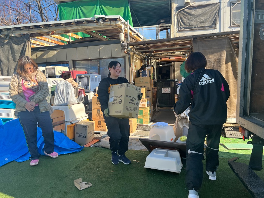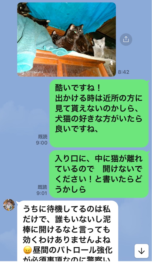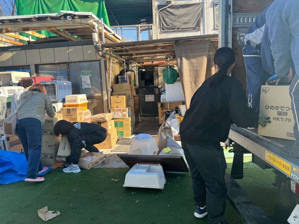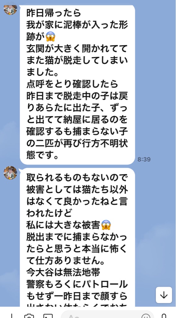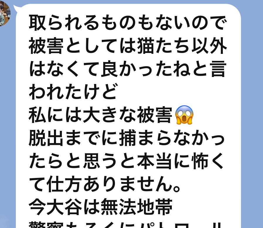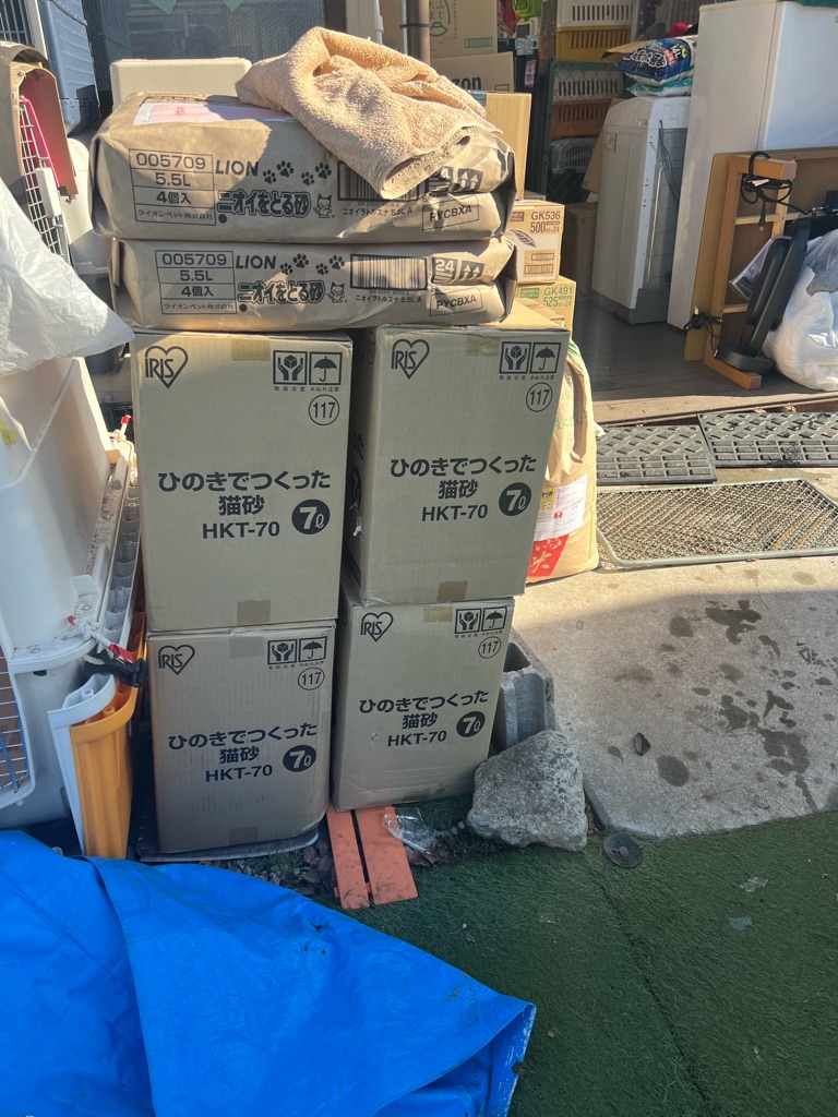 ブルーシートの下で寒さを凌いでいるのに 避難所に行っている間に泥棒に入られてしまい、2匹の猫が外に出てしまいました、