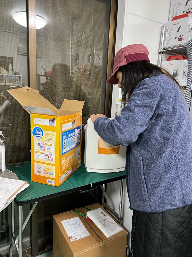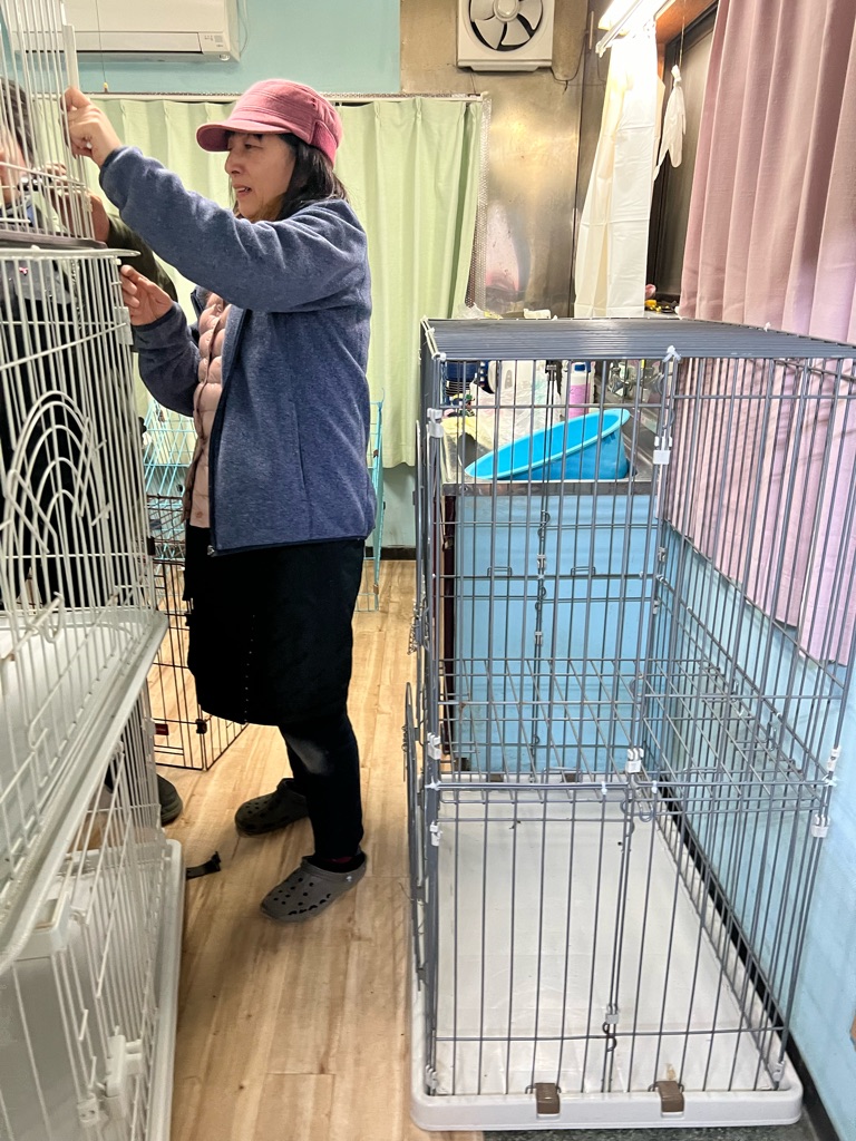 被災者さんが着くまで ケージの足りないものを組み立て、中にトイレをセットして、ご飯と水を