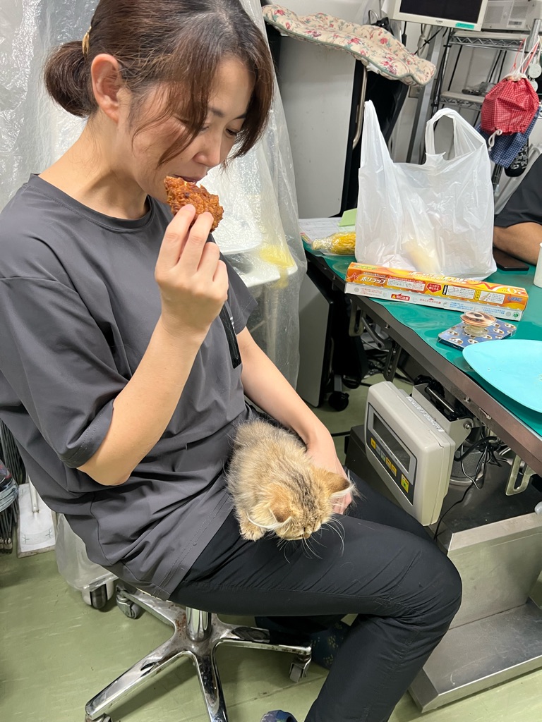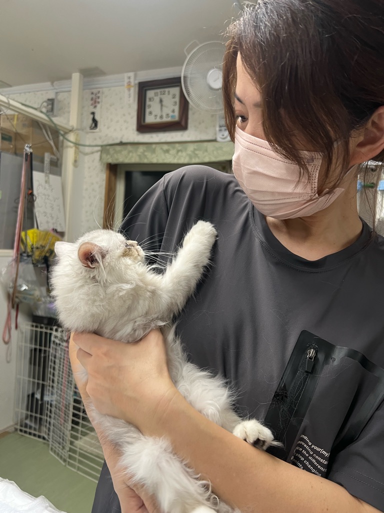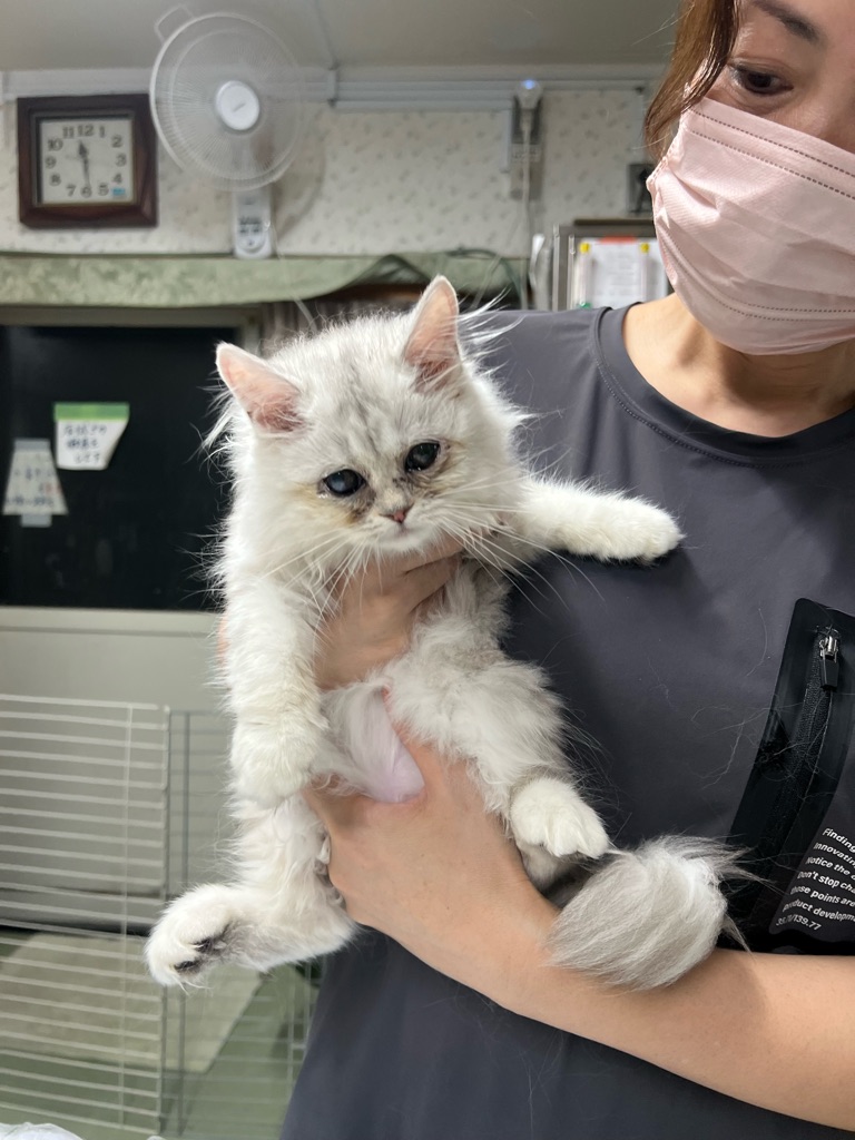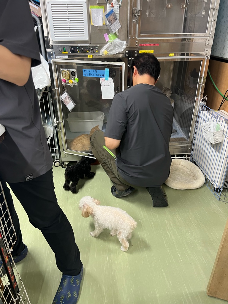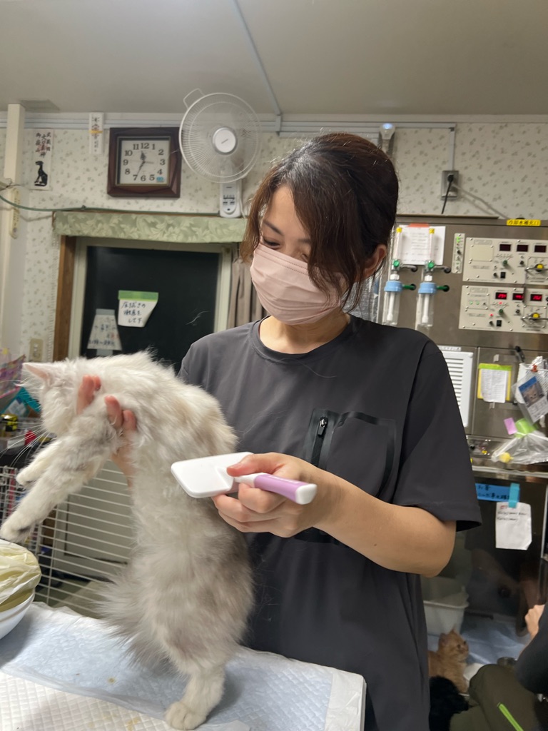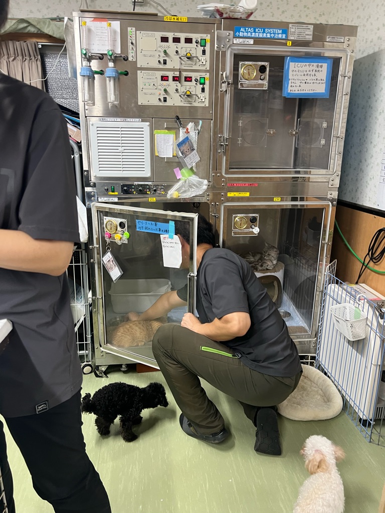 ICUには2匹の猫ちゃんがいます、呼吸器の疾患が有る子と 背骨の奇形で呼吸が苦しい子猫ちゃんです。