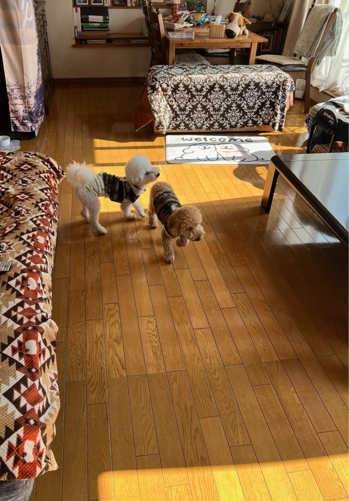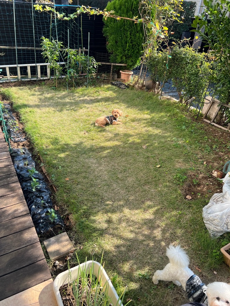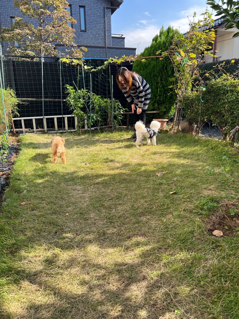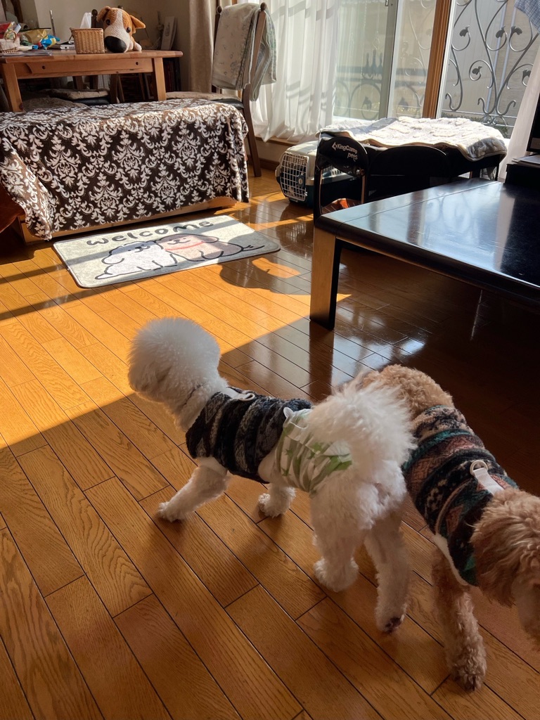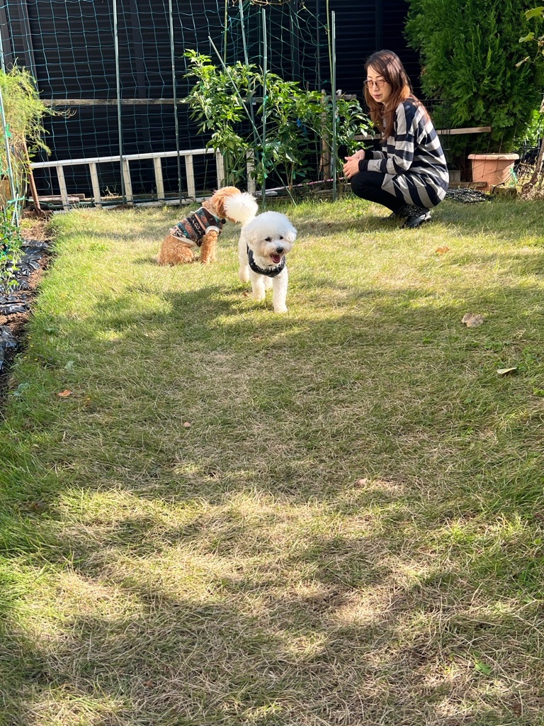 おトイレは家の中だと足を上げて家具の角などにオシッコしたいようですが、お庭ではできるのでオムツは付けたり外したりしています。