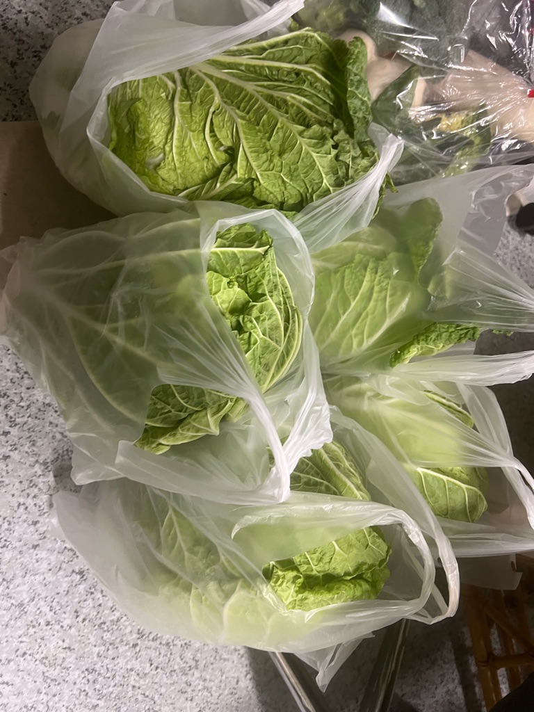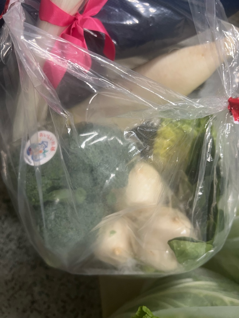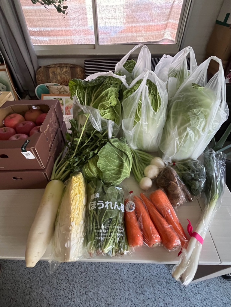 沢山の野菜、白菜がとても立派で大根やカブも皆んなで分担して犬達に煮て居ます。