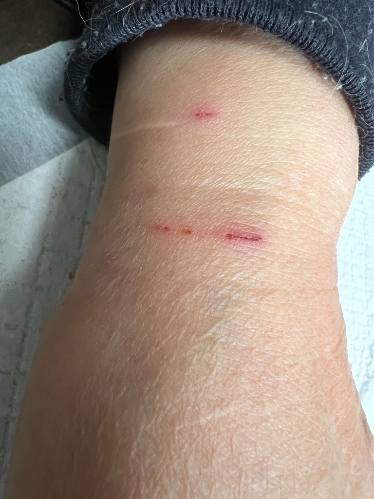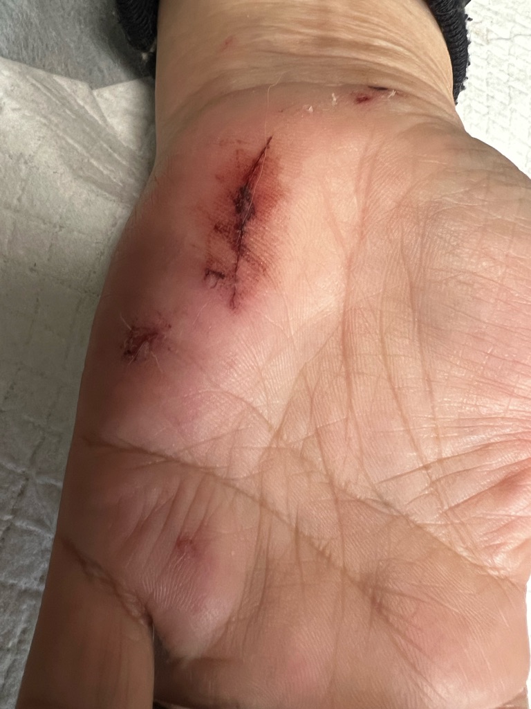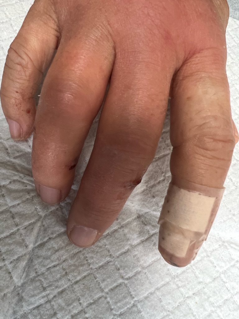 下は昨日 レスキュー時に猫に噛まれたスタッフさんの手、熱を持って腫れて来ています。とりあえず抗生物質と消毒です。